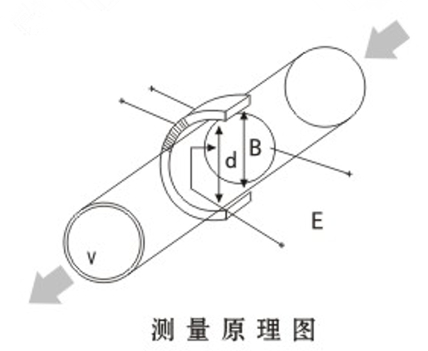 測(cè)量流量時(shí),導(dǎo)電性液體以流速V流過垂直干流動(dòng)方向的磁場(chǎng),導(dǎo)電性液體的流動(dòng)感應(yīng)出一個(gè)與平均流速成正比的電壓,其感應(yīng)電壓信號(hào)通過與液體直接接觸的電極檢出。對(duì)于同一流量計(jì)S. B. d為常量,所以流量與感應(yīng)電動(dòng)勢(shì)E(或流速V)的大小成正比。